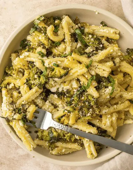 - Remove the feta and broccoli from the oven and immediately stir to combine. Pour in some of the pasta water until it’s your desired creaminess. Add the warm cooked pasta into the pan and stir again. Finish the dish with lemon juice, lemon zest, and fresh basil. Stir once more to fully combine and serve.
