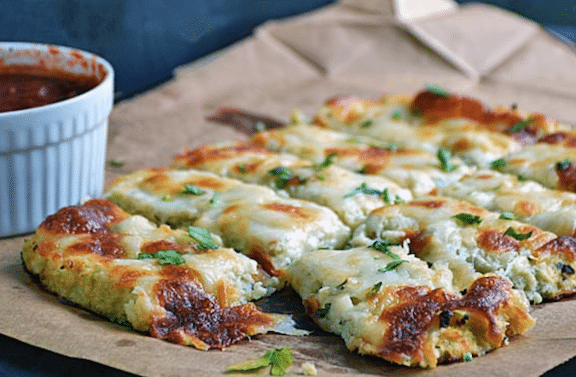 - Bake in the preheated oven for 10-12 minutes. Remove from oven and top with 3/4 cup shredded Mozzarella cheese and return to oven to continue baking until the cheese is melted and starting to brown. Cool about 10 minutes and cut into ‘breadsticks’. Garnish with fresh herbs and Parmesan cheese. Serve with your favorite Red Sauce and enjoy!