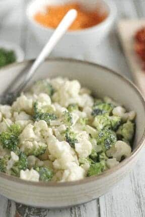 - Trim and cut the cauliflower into bite-sized pieces. Boil or steam until tender, approximately 10 minutes. Drain and cool completely. Trim and cut the broccoli into bite-sized pieces and add to a mixing bowl along with the cooked and cooled cauliflower.